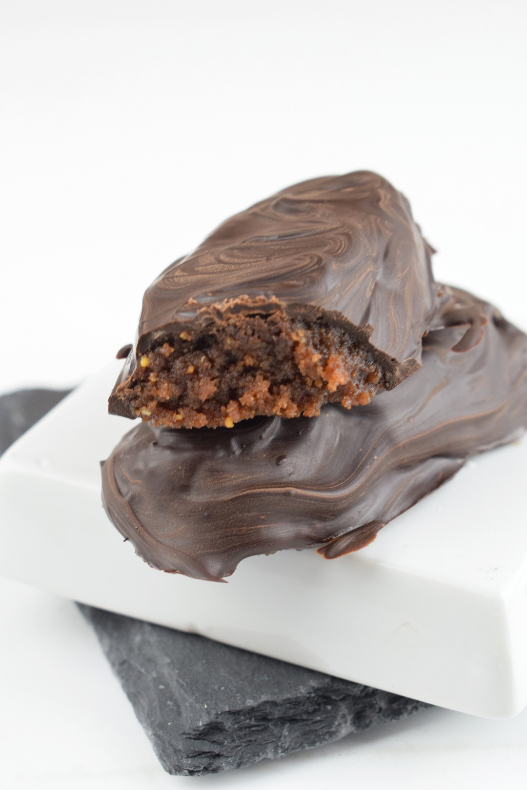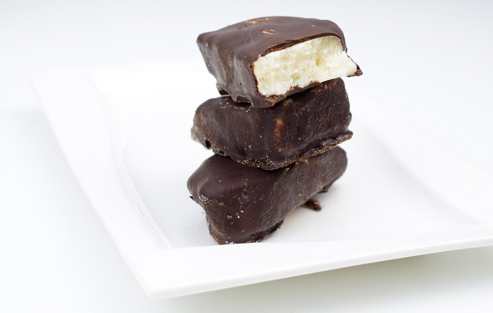 Mleko podgrzać razem z olejem. Następnie połączyć z odżywką białkową i owocami. Uformować masę na kształt kwadratu i odstawić do zamrażarki na około 30 minut. Następnie masę pokroić na małe kwadraty (u mnie wyszło 6 szt. małych batoników wielkości około 5 cm x 3 cm) masa jest dość klejąca i może dosyć ciężko odchodzić od pojemnika/talerza, na którym została uformowana, więc najlepiej uprzednio wyłożyć formę np. papierem do pieczenia lub posmarować formę olejem kokosowym). Batony oblać z obu stron gorzką czekoladą. Schować do lodówki na czas zastygnięcia czekolady. Batoniki mają ciągnącą się konsystencję.