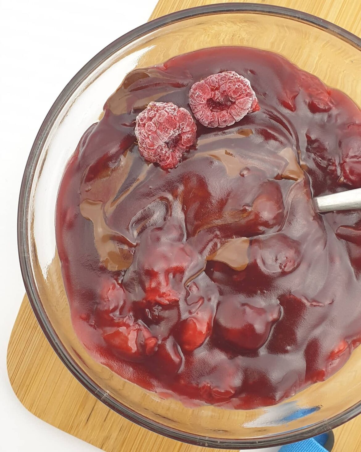 Wiśnie przełożyć do rondelka i dodać 50 ml wody. Gotować aż zmiękną, rozmrożą się i puszczą sok. Dodać erytrytol do smaku oraz czekoladę. Mieszać aż czekolada i erytrytol się rozpuszczą. Mąkę wymieszać z wodą i zagęścić.