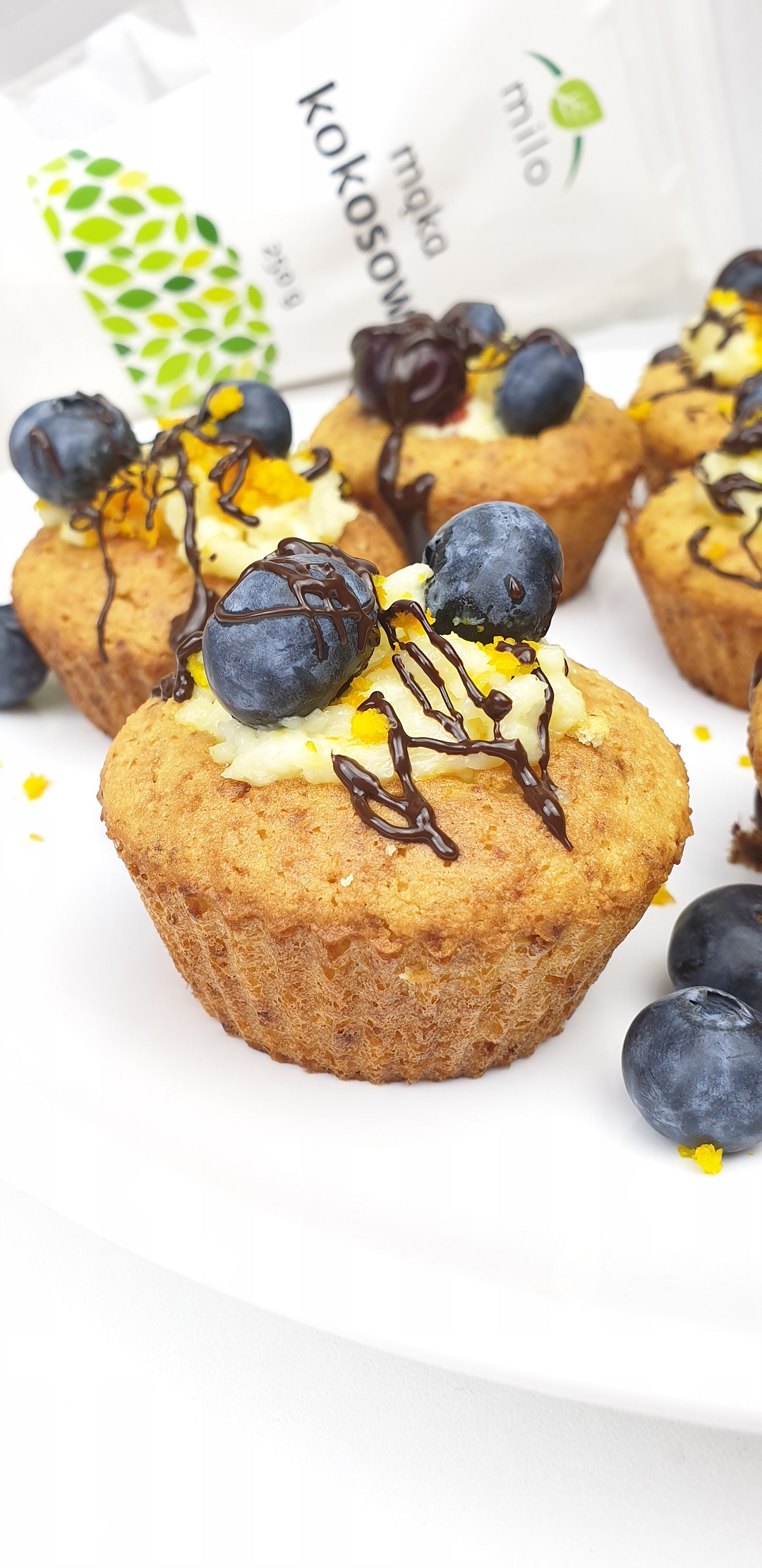 Białka ubić na sztywną pianę. Dodać, żółtka, erytrytol, sok oraz skórkę i delikatnie połączyć. Przesiać mąki wraz z proszkiem do pieczenia i ponownie delikatnie połączyć. Masę przełożyć do silikonowych form na muffinki (wypełniając je do ich 3/4 wysokości).