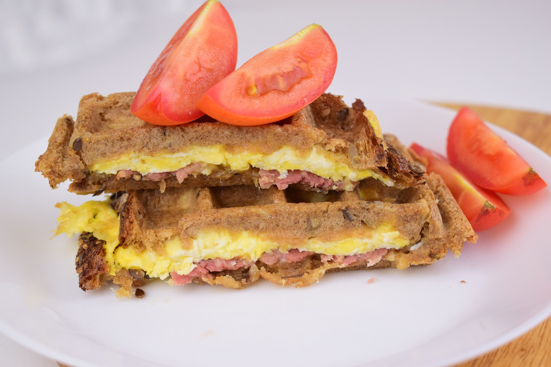 Usmażyć jajecznicę. Gotową jajecznicę, szynkę, ser ułożyć na jednej kromce chleba przykryć drugą i piec w gofrownicy, grillu na złocisty kolor.